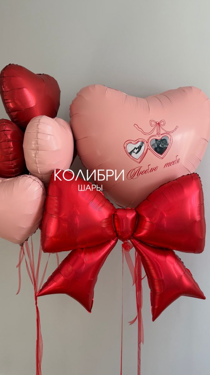 Большое сердце с фото и надписью, фольгированный шар бант и связка из 5 сердец