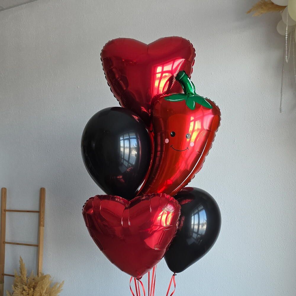 Связка из 7 шаров: 2 фольгированных сердца, фольгированный шар Перчик, 4 латексных шара
